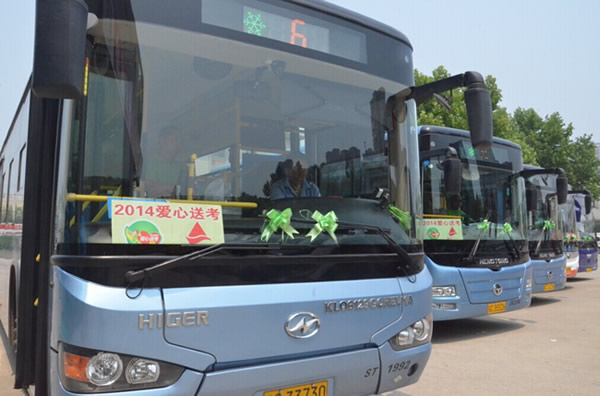 一年一度的高考是社會關(guān)注的熱點,每年這個時候,徐州的大街小巷都有這樣一個群體——送考愛心車隊。懸掛綠絲帶的送考車,成為城市道路上靚麗的風景。今年,公司也加入到“愛心送考,算我一個”2014愛心送考公益活動中,在66路、76路、65路、11路、608路等5條途經(jīng)考點的線路成立“愛心公交”送考專線。高考期間,考生憑準考證可免費乘坐這5條線路。為了給考生提供力所能及的幫助,駕駛員還在車上配備了方便袋、清涼油、創(chuàng)可貼等用品,以備乘客不時之需。圖為“愛心送考”啟動儀式現(xiàn)場。